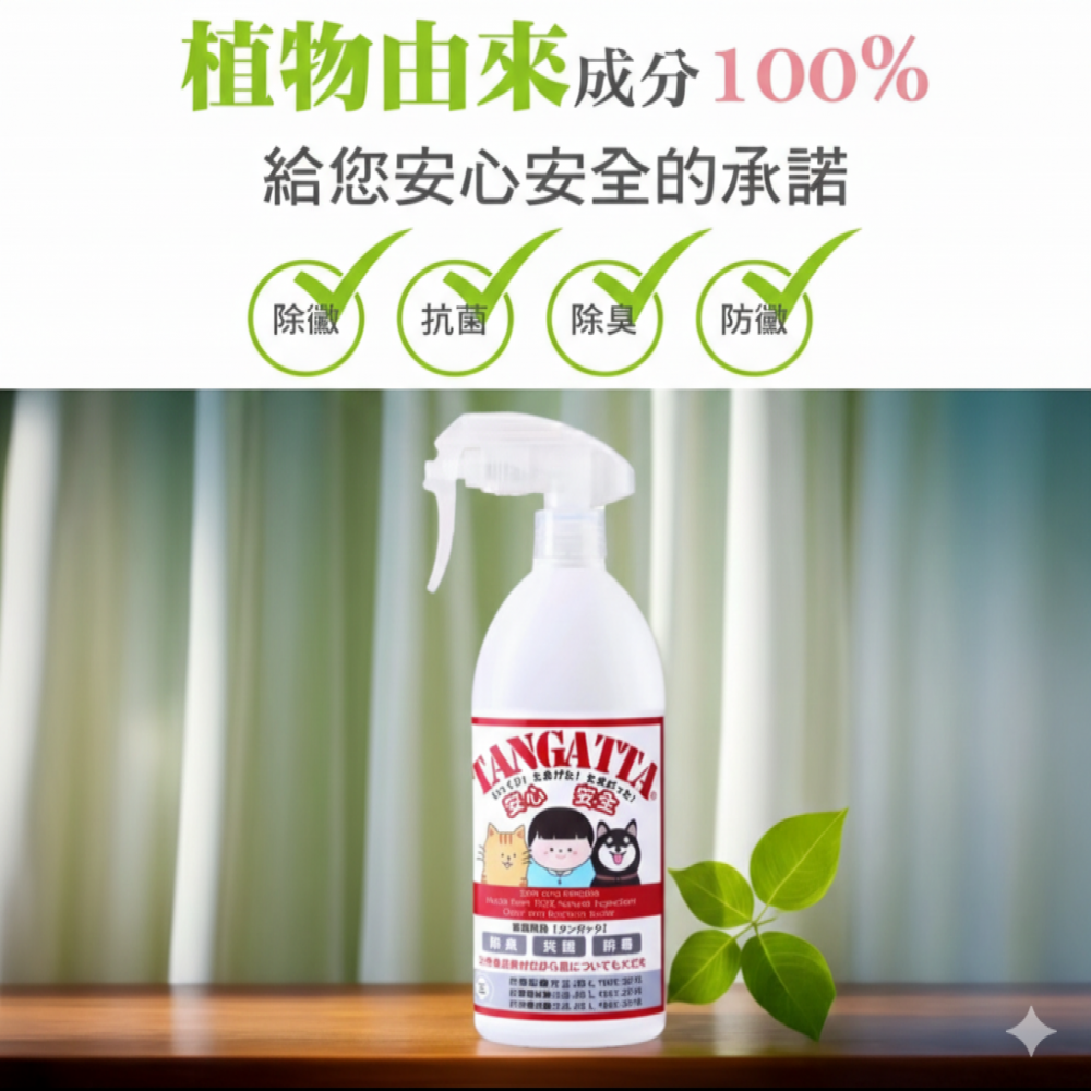 TANGATTA是日本LACTIVE公司以發酵食品為原料,獨家研發的液態有機酸オリゴマー,並添加厚生勞動省認證可抗流感病毒及貓杯狀病毒的葡萄柚種子萃取液,植物由來成份100%無添加任何化學物,經SGS抗菌除臭防黴12項認證 ,亮宇生物科技動物無急毐性認證安心安全,提供全家人和毛小孩安心安全的除臭抗菌防霉環境。適用範圍